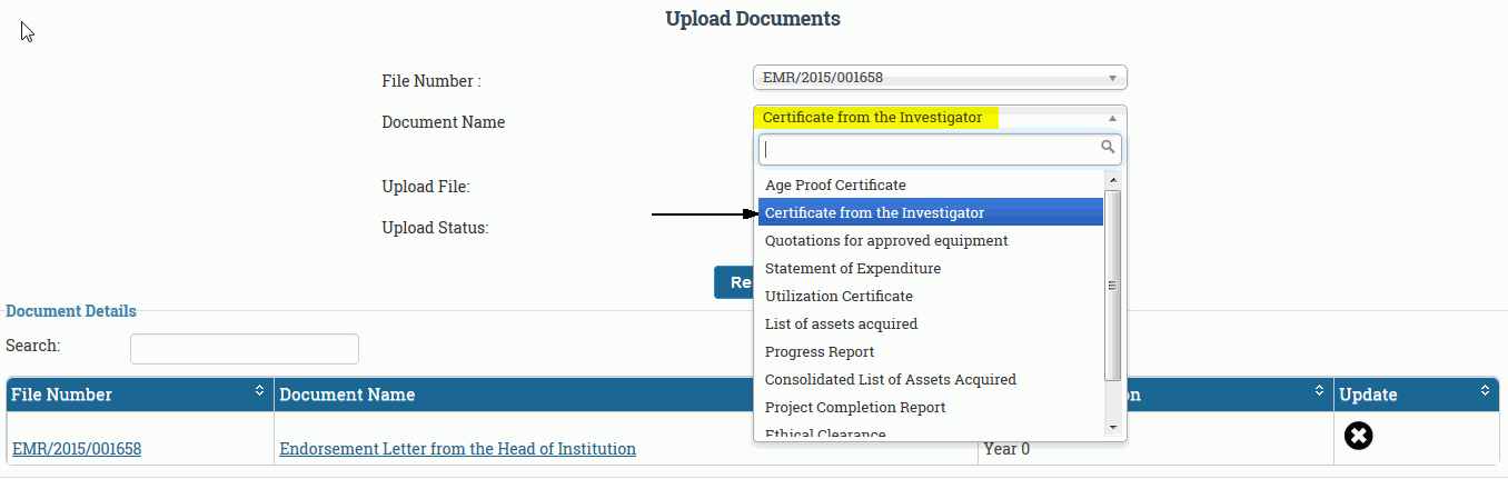 After Selecting the File Number you will get list of already uploaded documents as shown in Figure 6.5.