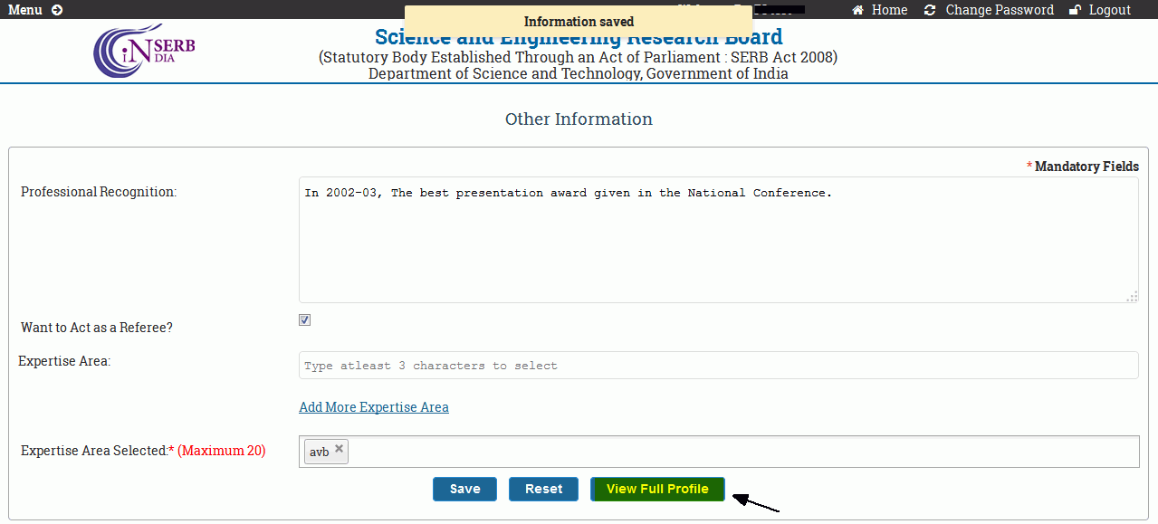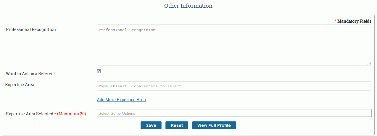 Fill in the details of your achievements in the field Professional recognition. In case, you want to act as referee click on the checkbox beside "Want to act as a Referee?",as shown in Figure 2.6.