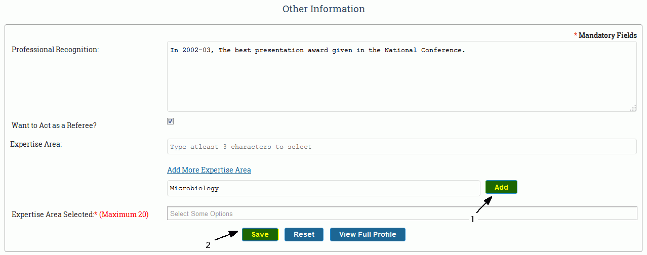 If you want to add new keyword click on the hyperlink shown in Figure 2.6 , a new text box will be displayed. Click on the ADD(1) button to add it to your expertise area and to the database.