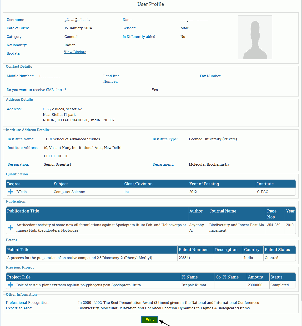 The full profile will appear as shown in Figure 2.8. If you want to have hard copy of profile, click on the Print button at the bottom of the page.