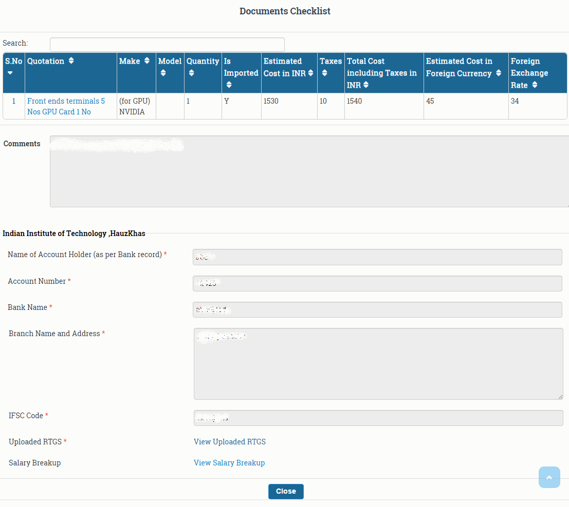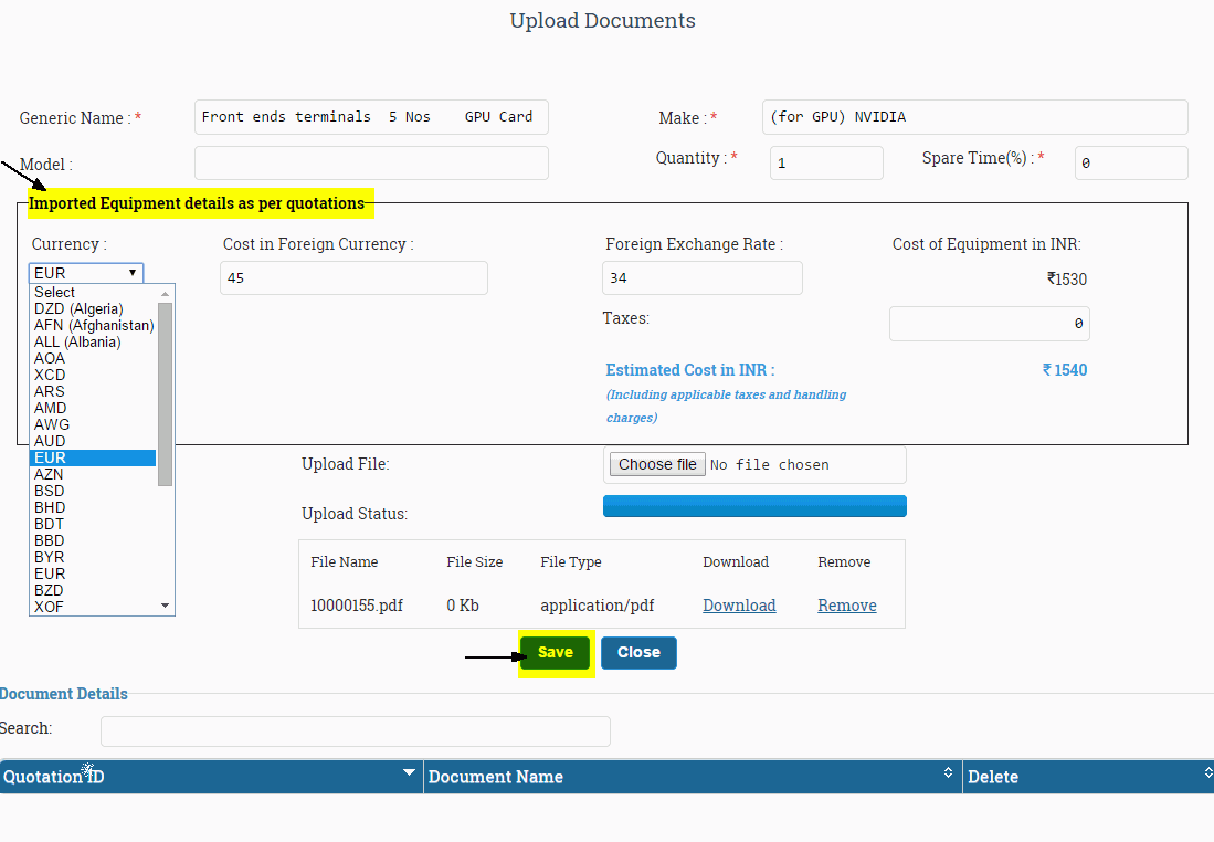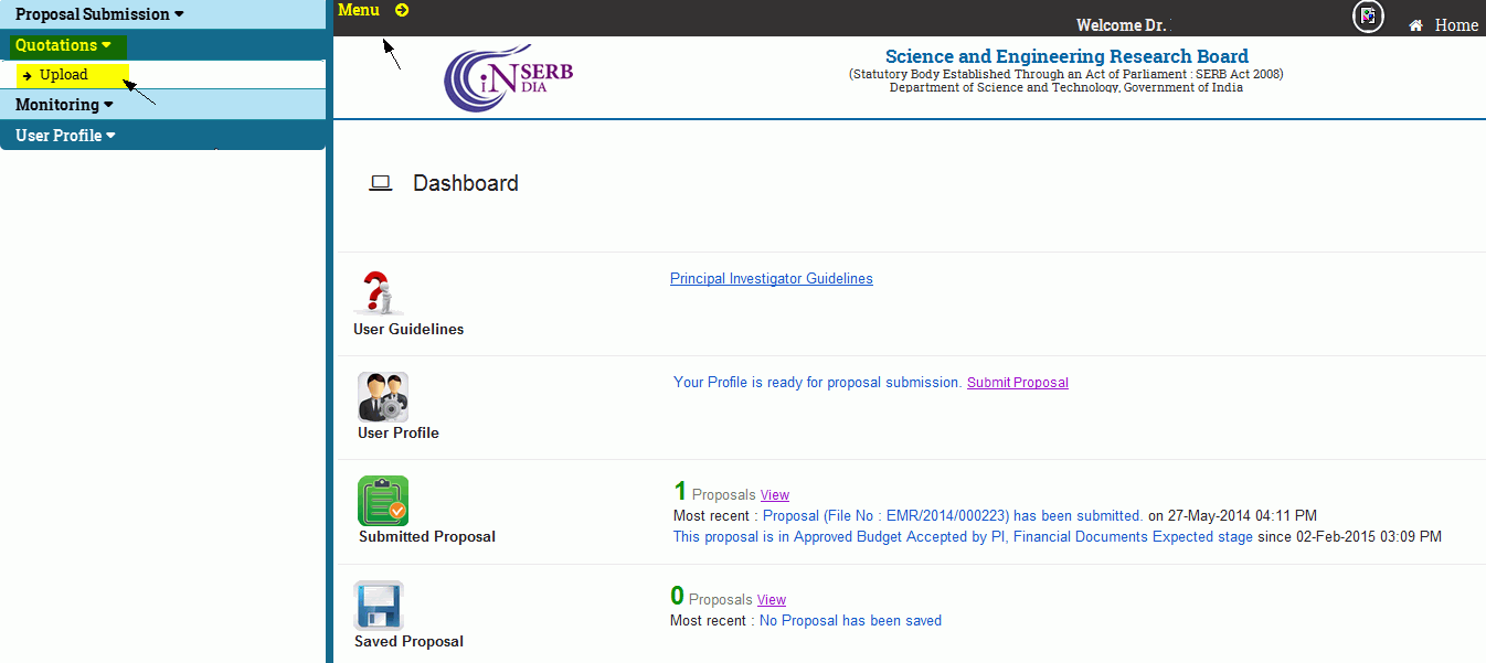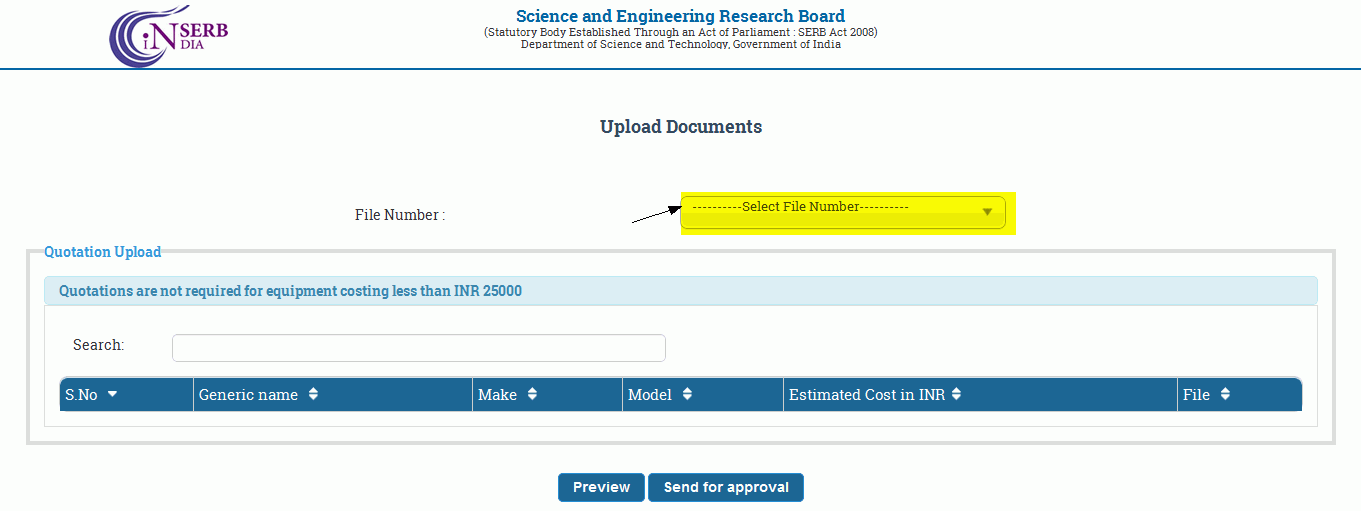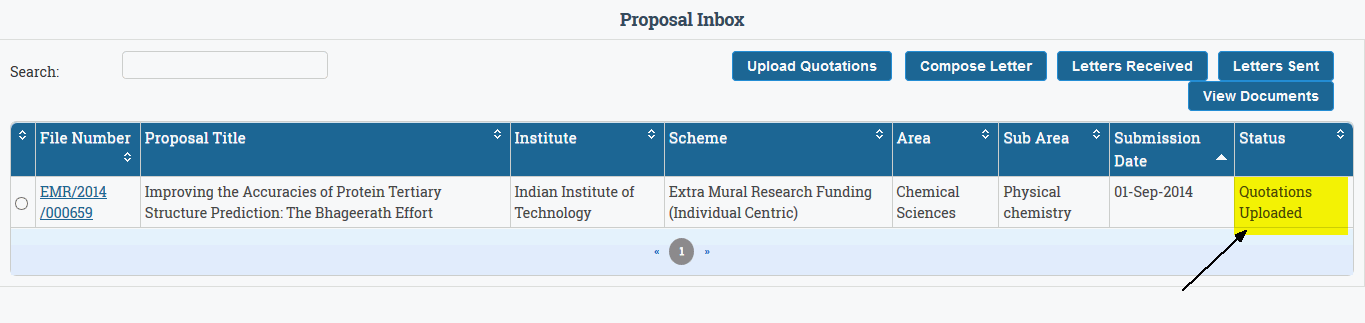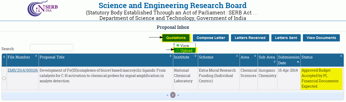 Once your proposal is administratively approved and you have acknowledged the acceptance of Approved budget (Click here to know How to acknowledge the Accept ) , then you can upload the Quotations of your approved equipments.