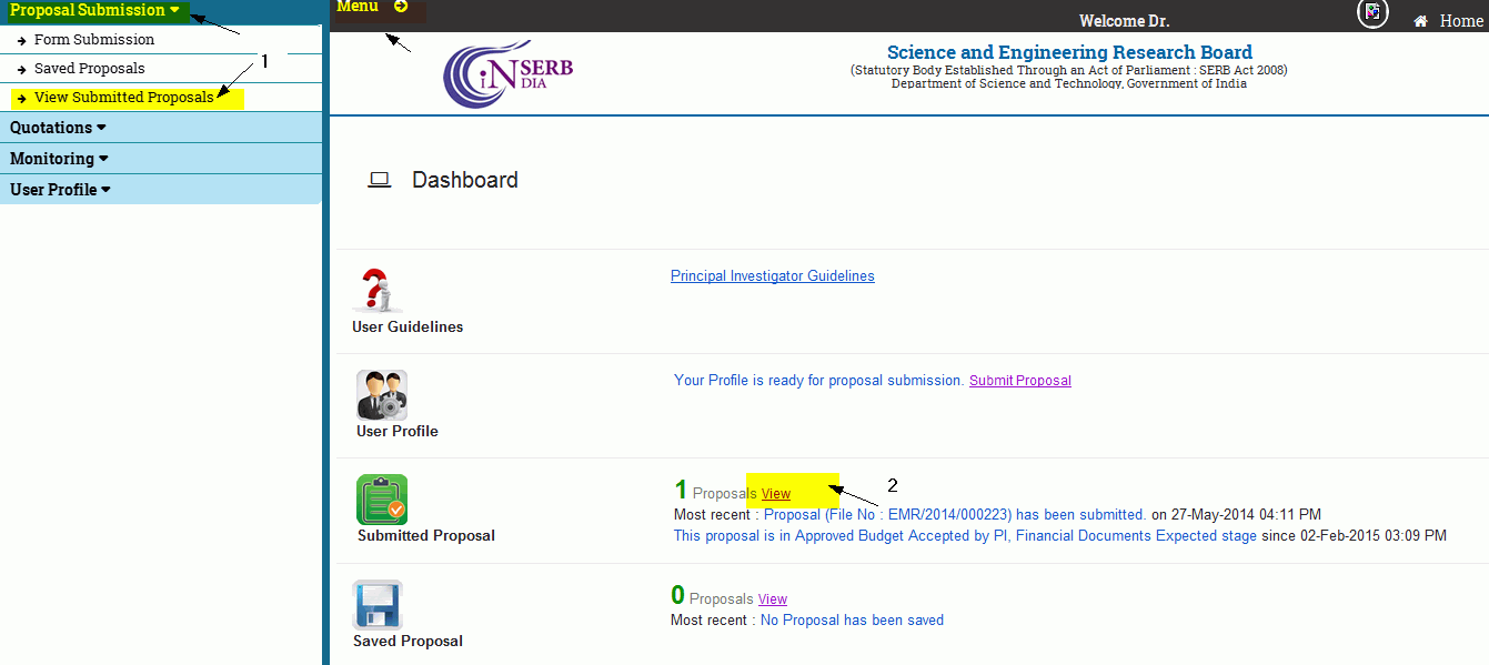 You can also upload your quotation in this manner , go to "Menu" and select "View Submitted Proposal" (numbered 1) from Proposal submission menu as shown in Figure 4.2. You can also check your recent submitted proposal details from the Dashboard by clicking on "View" as shown in Figure 4.2 (numbered 2).