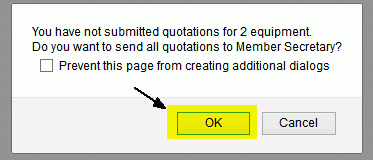 It is not necessary to upload quotations for all the equipments. If you have not submitted quotations for all the equipment than following message appears as shown in Figure 4.17 by clicking on "Send for Approval" button.
