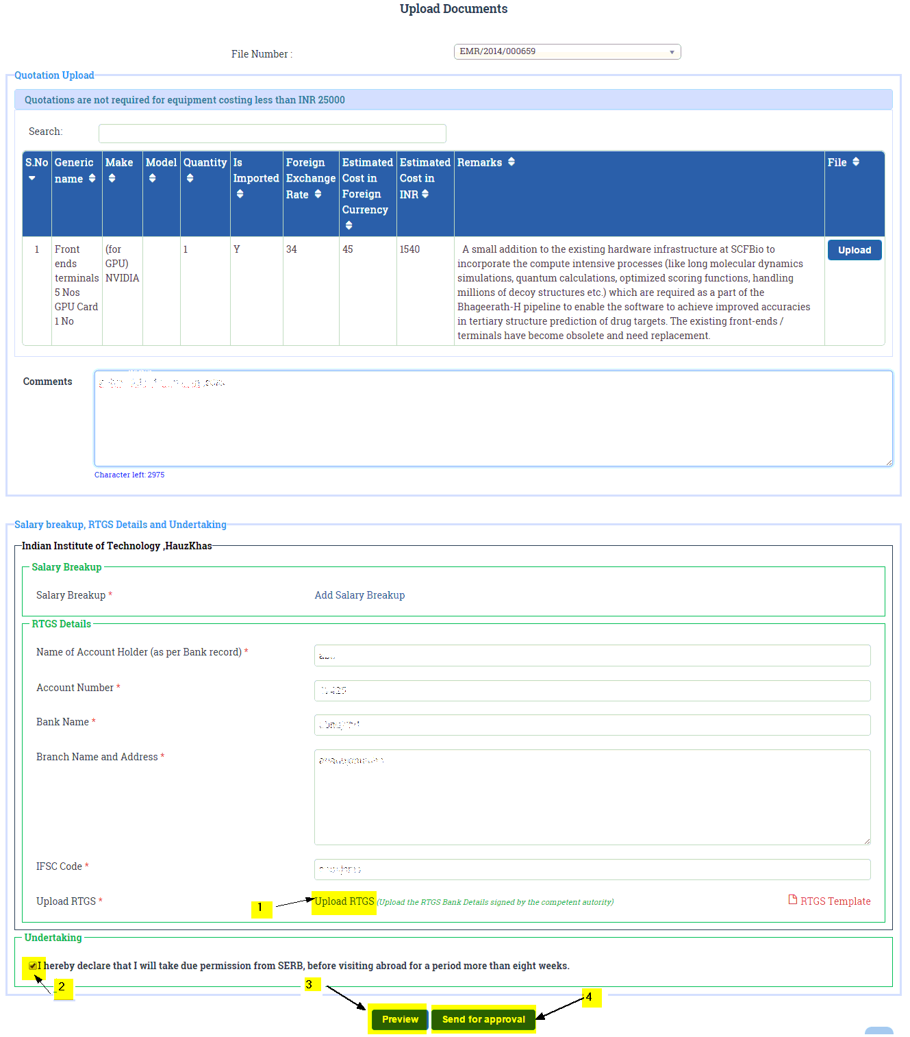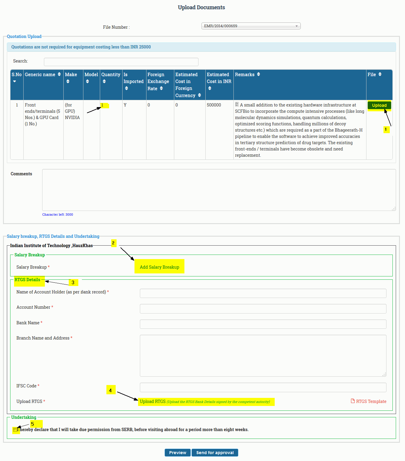 Fill all required RTGS Details and also upload RTGS Bank details by Clicking "Upload RTGS" link as shown in fig. 4.12 (numbered 1) then click on "Send For Approval"(numbered 4) button to finally submit the details. Before Submission , if you want to recheck all the filled details , click on Preview (numbered 3) button as shown in Figure 4.12.
