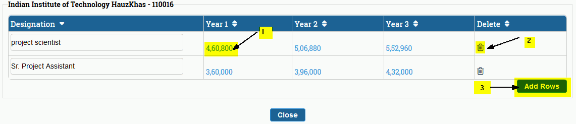 If you want to add more manpower details ,you can click on Add Rows button (numbered 3) fig. 4.10 , and fill all the necessary details. You can also delete a row if it is not required by clicking on Delete icon (numbered 2) as shown in Figure 4.10.