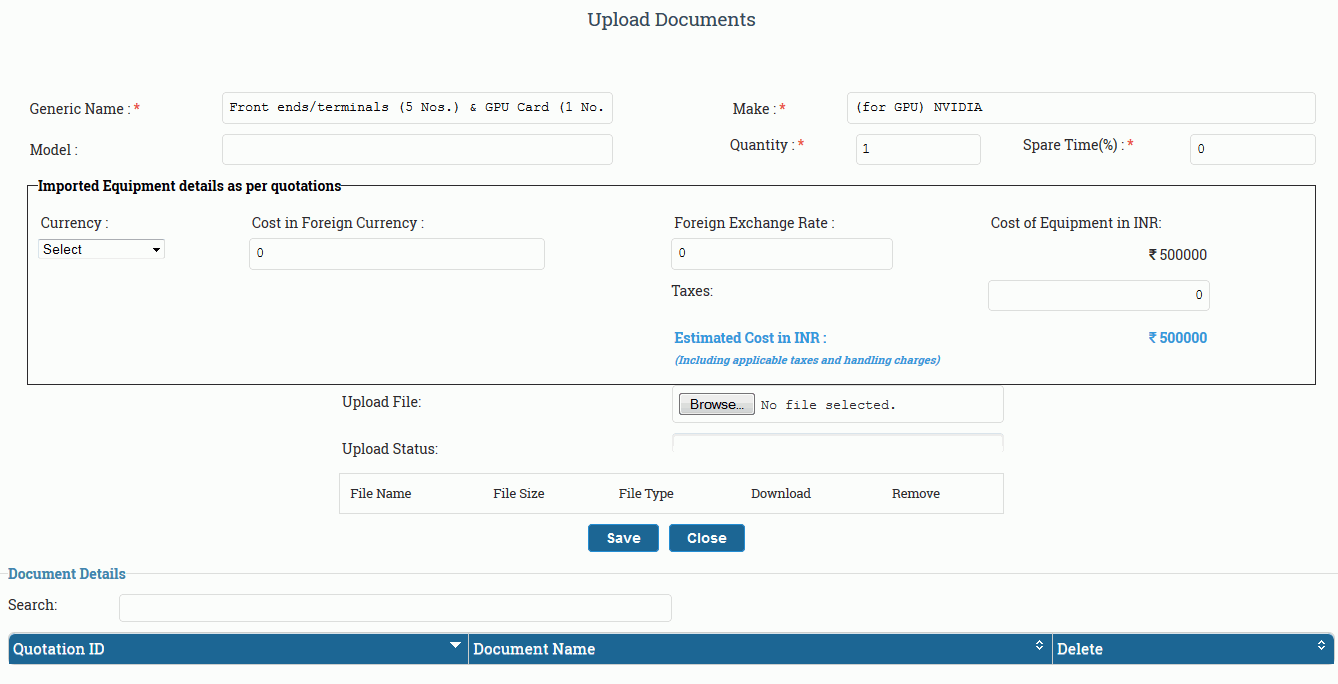 Here you can fill all the required details of equipments . In case of imported equipments ,you have to select the currency type and then fill the required fields like cost in foreign currency, foreign exchange rate , tax details as shown in Figure 4.7.