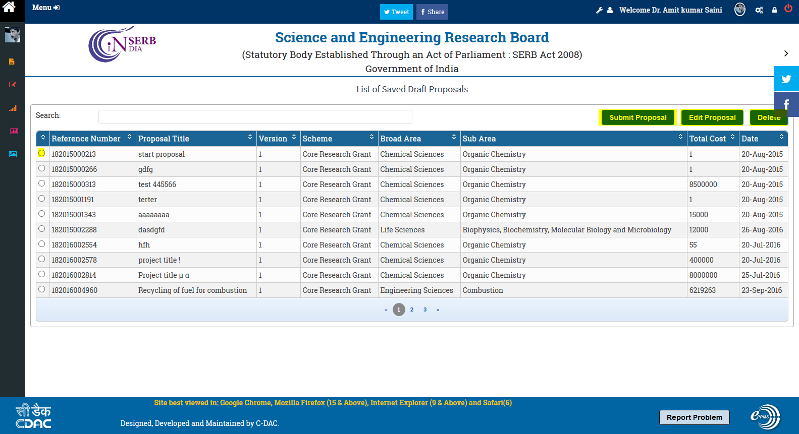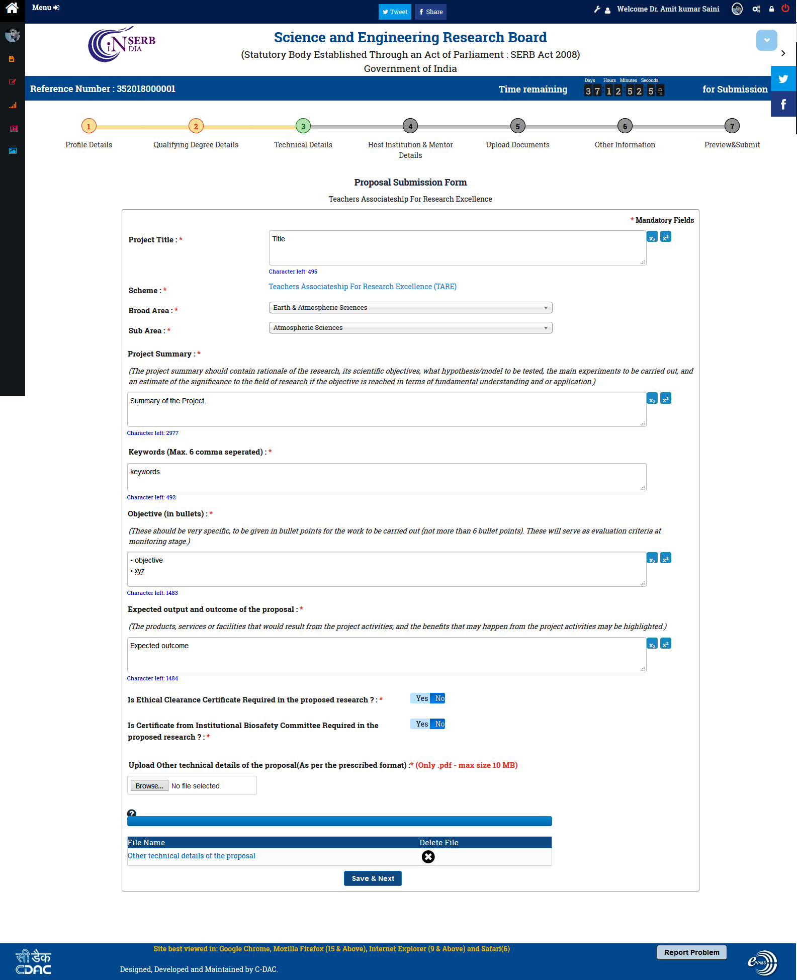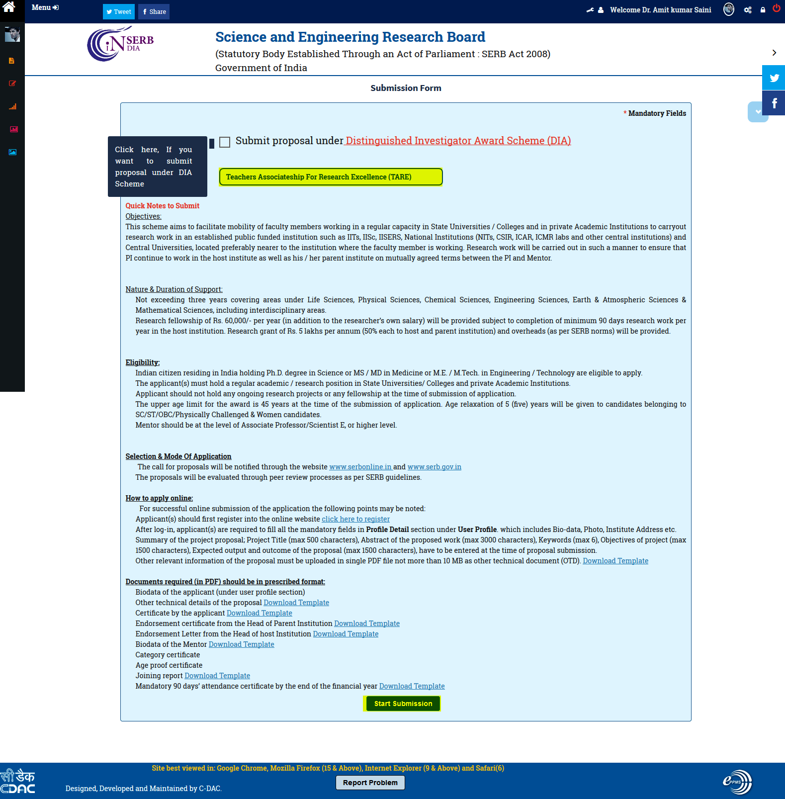 This screen will show all the details and instruction about the scheme and after clicking the Start Submission Button you can start the proposal submission as shown below:-
