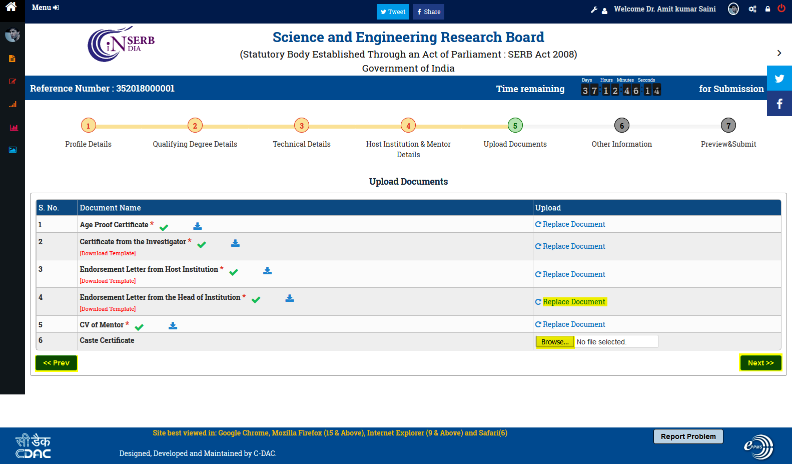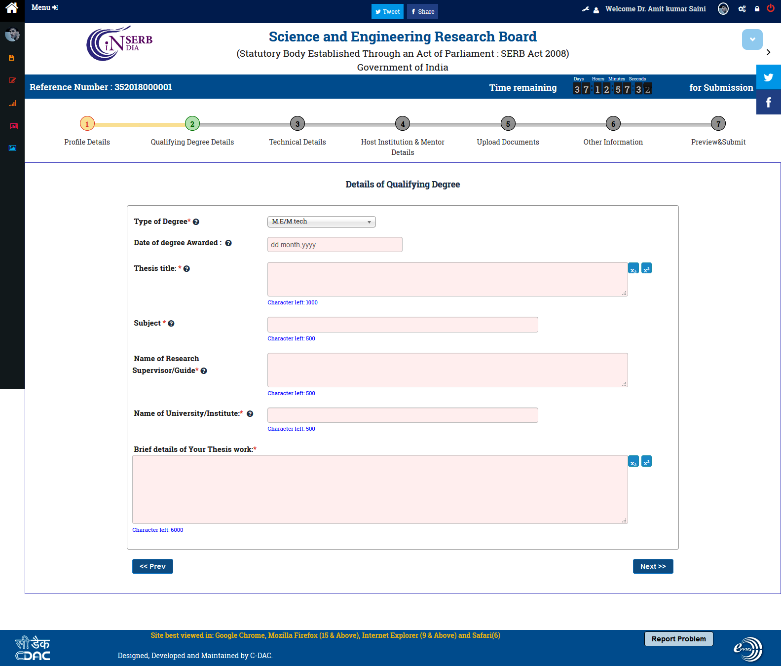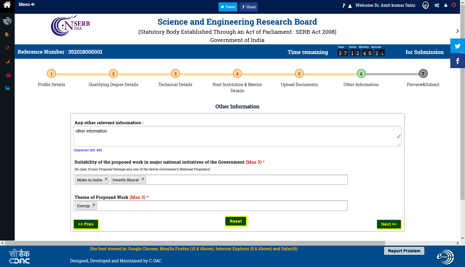 This screen will show all the details and instruction about the scheme and after clicking the Start Submission Button you can start the proposal submission as shown below:-